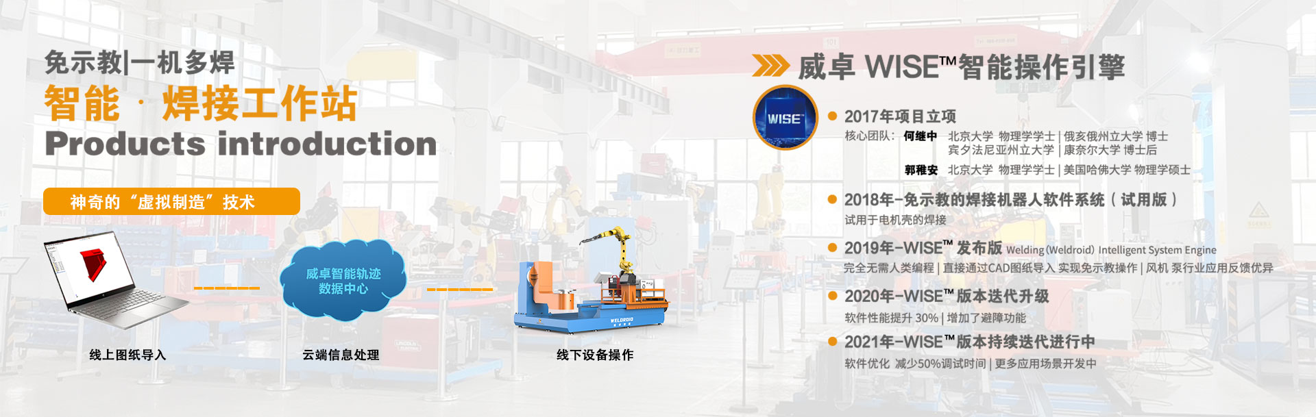 無錫威卓智能機器人有限公司成立于2017年,是無錫市政府引進的科技領(lǐng)軍型高新技術(shù)企業(yè),公司研發(fā)團隊80余人,我們堅持自主創(chuàng)新,利用自主開發(fā)的虛擬制造技術(shù)對傳統(tǒng)焊接行業(yè)進行升級改造。 公司主推的工業(yè)風(fēng)機系列-智能焊接工作站產(chǎn)品,具有免示教、實時跟蹤、簡易工裝、傻瓜式操作等優(yōu)點,真正幫助企業(yè)解決了招焊工難,用工成本高,焊接質(zhì)量不穩(wěn)定等問題。
