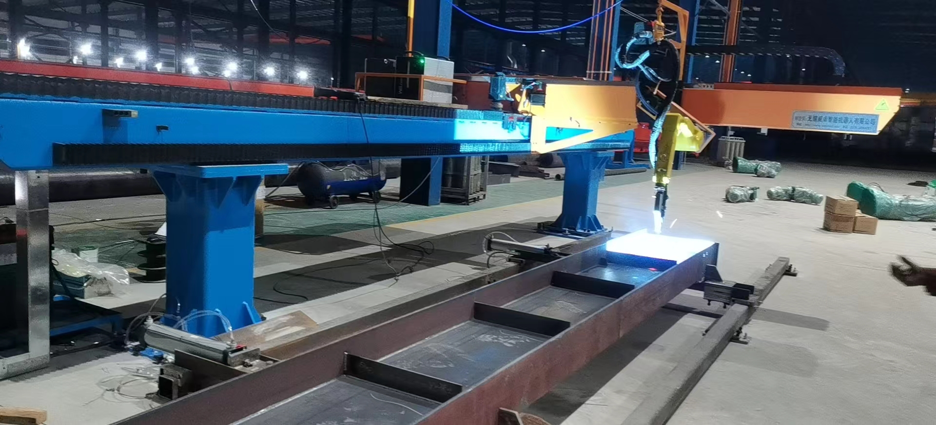 智能焊接在鋼構(gòu)行業(yè)的成功應(yīng)用針對鋼結(jié)構(gòu)中常見的H型鋼等鋼梁工件,威卓設(shè)計研發(fā)了小龍門智能焊接工作站,焊槍部分使用鋼梁專用焊槍,更適用于鋼梁焊接;搭配傳感器使用,自動尋位識別焊縫,無